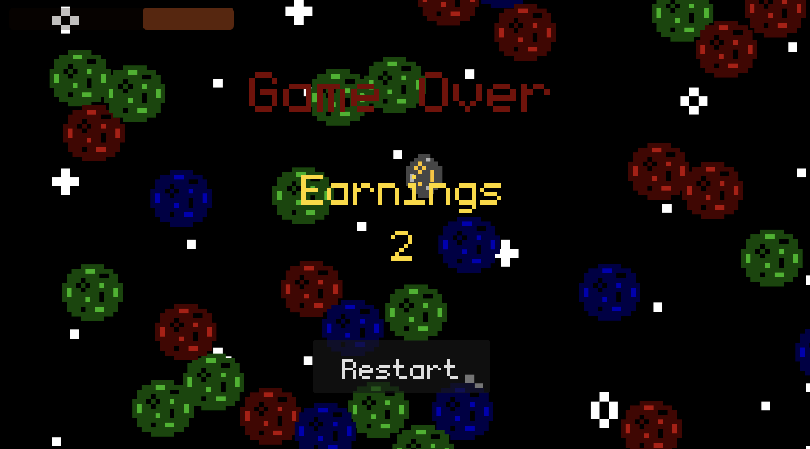 You are on an intergalactic mining mission. Collect as much gold ore as you can while avoiding meteors. Burning fuel costs money, if you don't collect gold fast enough you are pulled from your mission.