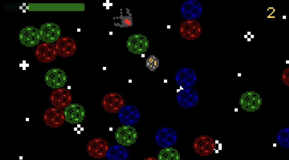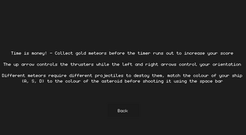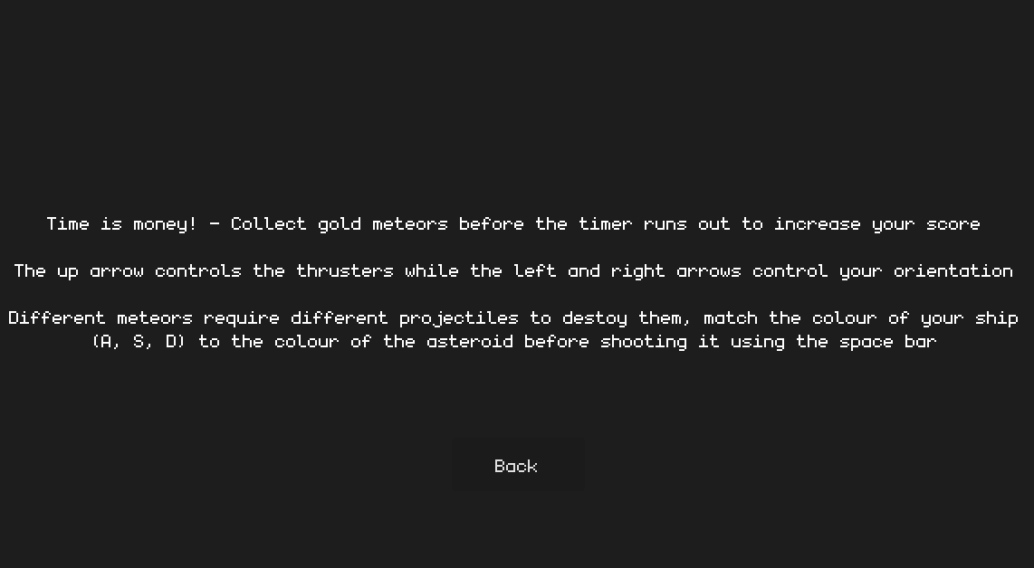 Different meteors require different projectiles to destoy them, match the colour of your ship (A, S, D) to the colour of the asteroid before shooting it using the space bar